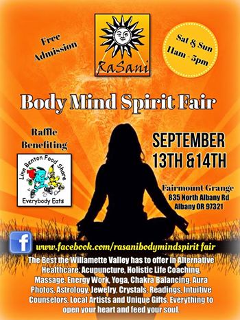I am pleased to announce I will be at the annual RaSani Body Mind Spirit Fair once again this September. I had a blast having a table and meeting many, many people for all over the Willamette Valley last year at this event. This year, I will again have a table setup to do mini-reading and short counseling sessions. This event is put together by Vickie Pruitt and will feature healers, readers and vendors specializing in energy work, astrology, crystals, yoga, aura photos and an assortment of readers and artists. If you are in the Albany/Corvallis area, please stop by!