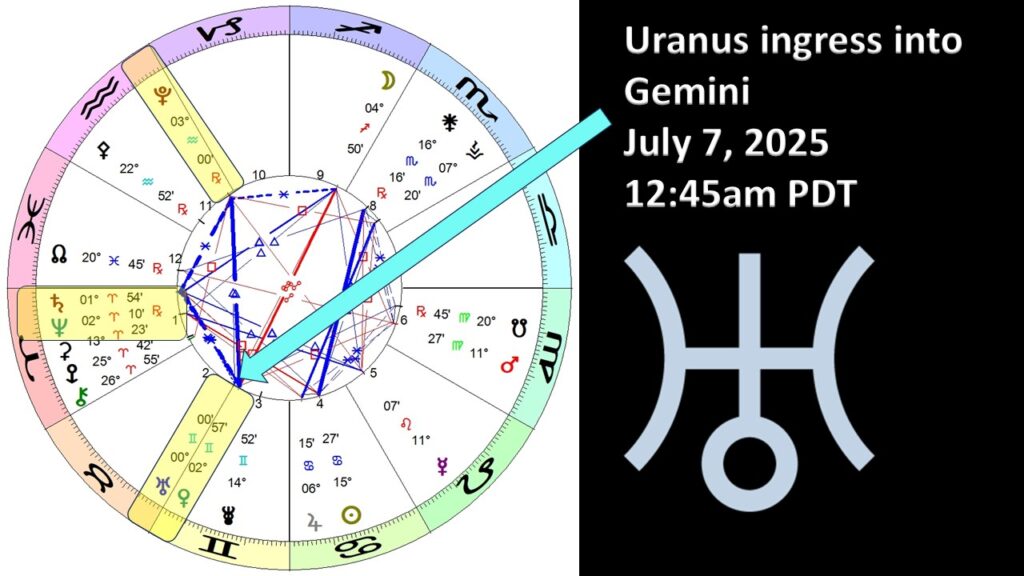 Fresh off Venus’ conjunction with Uranus, we’ve reached the edge of a new beginning with Uranus as it ingresses into the sign of Gemini on July 7, 2025. This is the last of the major outer planets to ingress into a new sign since November, 2024. As of tomorrow, Uranus, Saturn, Jupiter, Neptune and Pluto are in new signs. This is exceedingly rare for all of them to ingress into new signs in a relative short span of time.